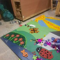 The mural took about a month to complete and we enlisted the help of the local Scouts (9th Westmeath Scouts) and other volunteers to help sort the bottle caps into their respective colours and screw each individually in place. In early July 2023 we were ready to unveil the enormous 9000+ thoursand bottle cap mural in the centre of the village as a means to highlight the volume of single-use plastics in circulation and their impact on the environment.